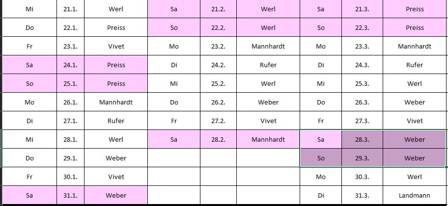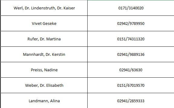 Im Falle eines lebensbedrohlichen (!) Notfalles erreichen Sie die diensthabende Praxis unter folgender Telefonnummer, Tabelle siehe unten).